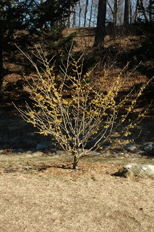 During the gray days of winter, the least bit of color pops. Spring witchhazel in bloom.