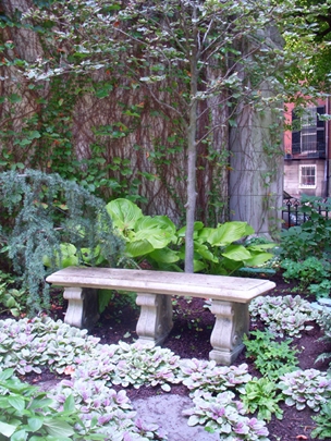 enlarge this imageIt's a pretty composition, with 'Sum & Substance' hostas behind a bench, A weeping Atlas blue cedar next to it, tricolor beech above, and 'Burgundy Glow' ajuga in front. Yet what came first as we designed it was choosing and placing the bench, and laying out the path to reach it.