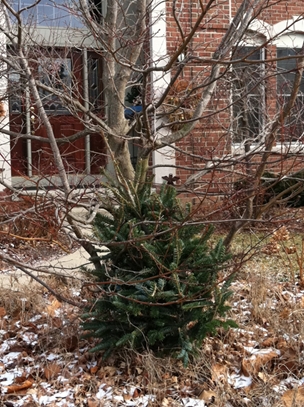 enlarge this imageJust because the mistake's a done deal and the Japanese maple's trunk has already been damaged by that full-on winter exposure, doesn't mean the tree shouldn't be protected from further harm. Here, a cast off Christmas tree is put to good use shading and insulating the at-risk portion of the trunk.