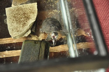We're boarding friend Beaufort Cranford's musk turtle, Darwin.