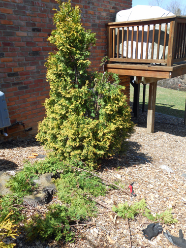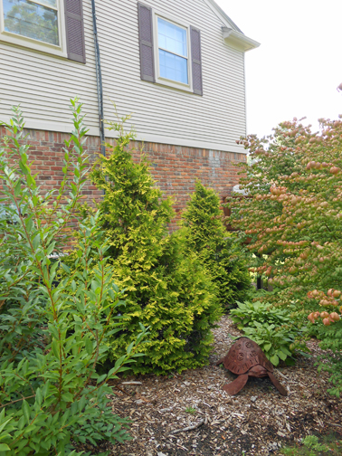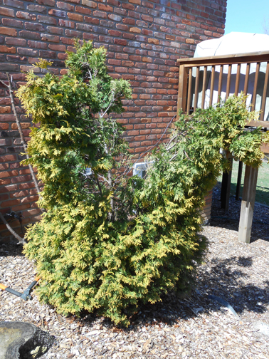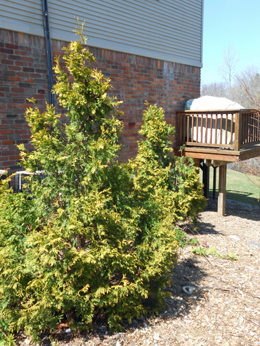 Winter snow and ice, arborvitaes' multiple tops splay.