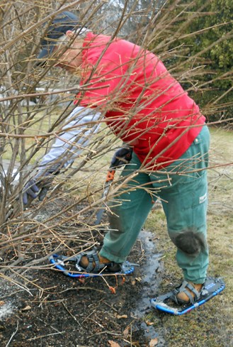in spring. We'll wear snowshoes today as we cut down butterfly bush