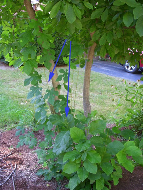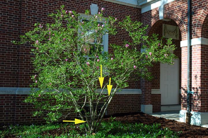 enlarge this imageMagnolias often have multiple trunks, but too many is not pretty or healthy. Arrows mark trunks to be sawed, soon. As the trunks increase in girth, those in the middle of the clump will be squeezed out. As George E. Brown wrote in "The Pruning of Trees, Shrubs and Conifers", it's "the effects of bad training in a young specimen..."