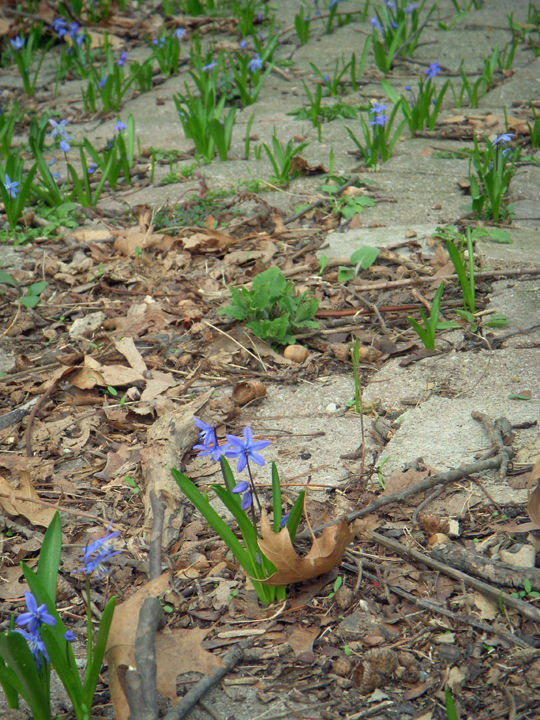 enlarge this imagePretty, blue, early, what's not to love about Siberian squill (Scilla sibirica)? Maybe the plant's ability to grow anywhere and prolific ways? Yet they do come and go early, and leave the space free for other plants, if we can just put up with a transition period featuring a carpet of yellowing grass-like leaves.