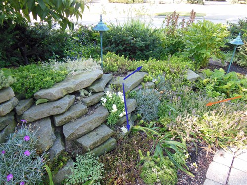 Right: Two sedums (blue arrows) and a thyme (orange arrow)