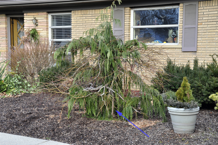 Now the falsecypress' evergreen branches can shade the maple's thin barked, vulnerable area. In addition, we've tied more clippings of the falsecypress to the base of the maple trunk to shade it and help trap ground warmth.