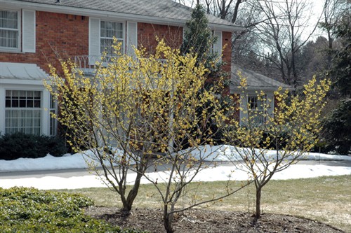 During the gray days of winter, the least bit of color pops. Spring witchhazel in bloom.