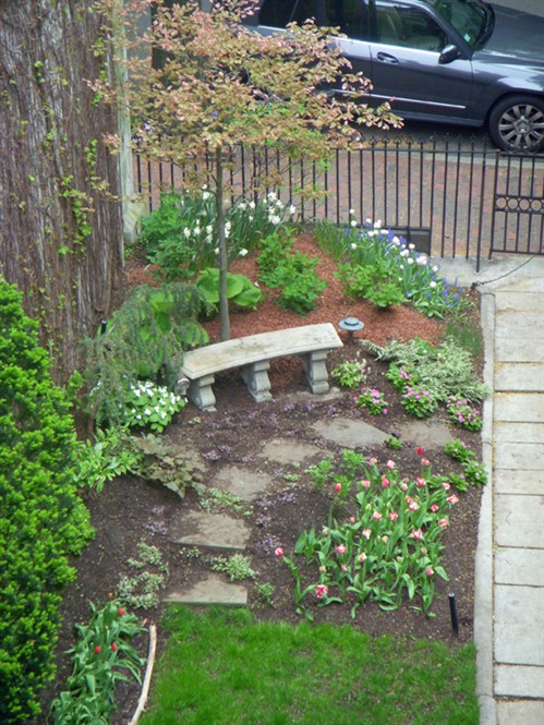 enlarge this imageIt's a pretty composition, with 'Sum & Substance' hostas behind a bench, A weeping Atlas blue cedar next to it, tricolor beech above, and 'Burgundy Glow' ajuga in front. Yet what came first as we designed it was choosing and placing the bench, and laying out the path to reach it.