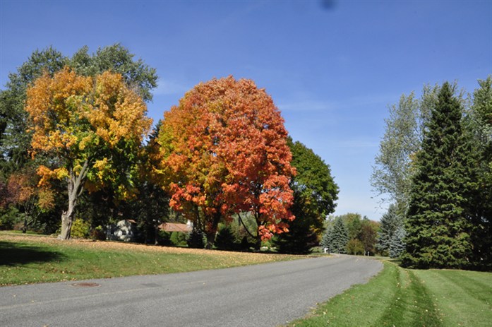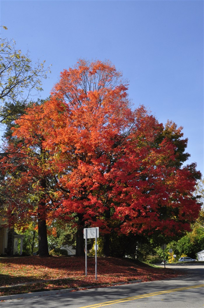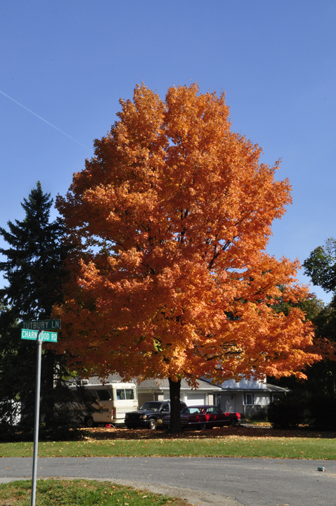 The shape of a tree stands out when it's in fall color. Sugar