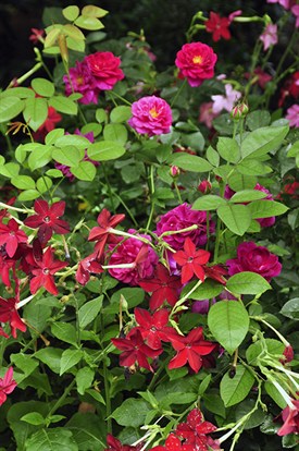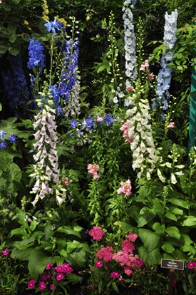 delphiniums, bellflowers, roses) and on into hot hues by late