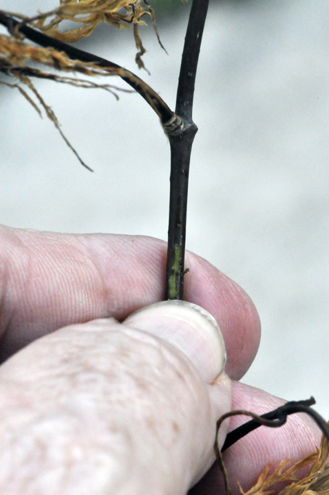 Clear soil from the crown and look for pink, green or waxy tan