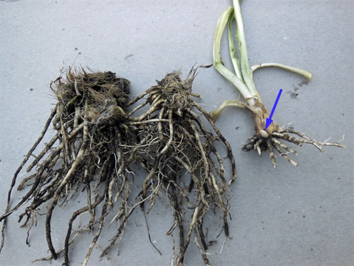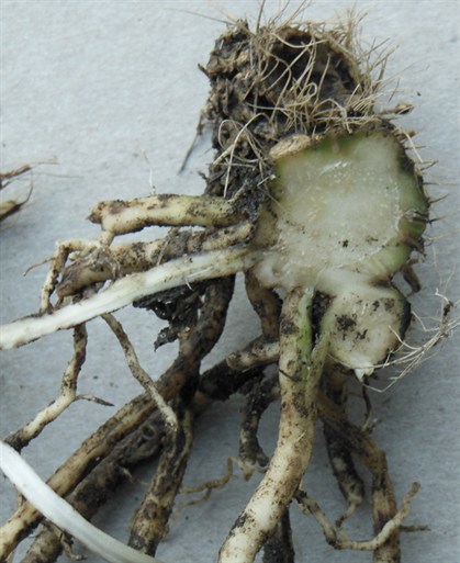 between roots and crown. If roots are flexible and uniform in color