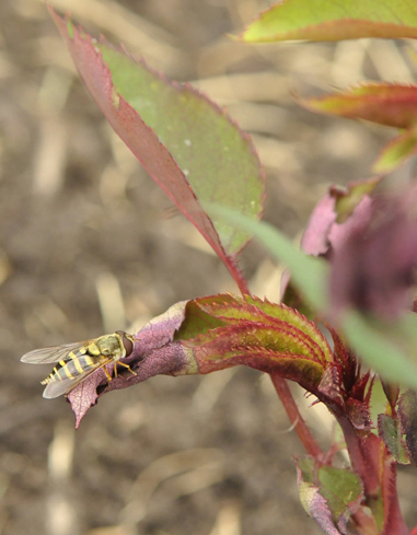 Predators such as syrphid flies (the wasp-y looking critter,