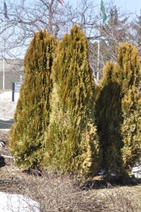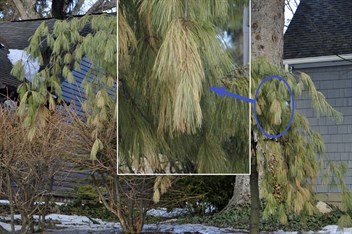 weeping white pine (at right, Pinus strobus 'Pendula') may