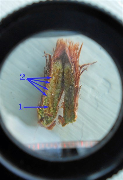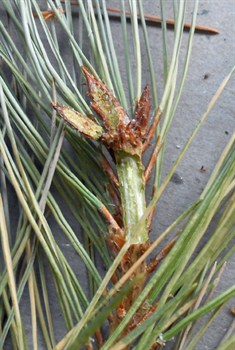 Right: A bud from the weeping red pine, cut open to check