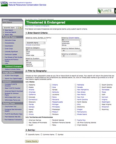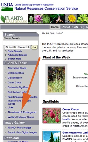threatened/endangered button on plants.usda.gov and then click on a State or