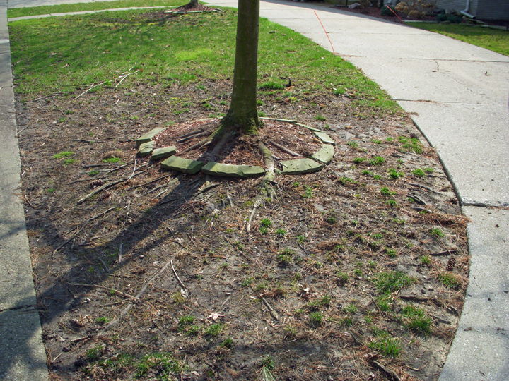 Increase the size of the circle as the tree grows, to eliminate plants above the new roots at the edge of the root zone. Loosen the soil in that new outer ring.