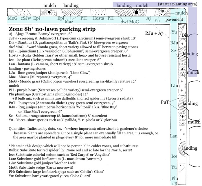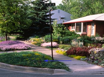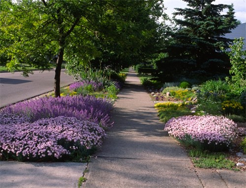 Right: We filled the sidewalk-crossed corner of this no-lawn lot