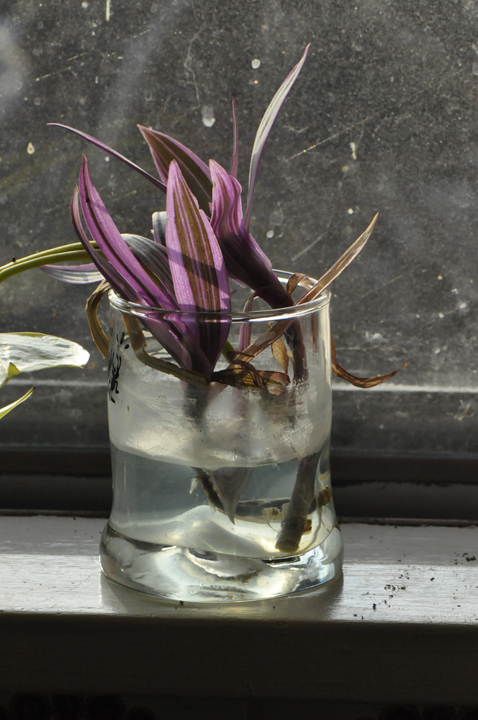 It took only two weeks to develop visible roots. Time now to put it into potting soil. If we let it grow a lot more roots in water we will only have to cut them off when we repot.