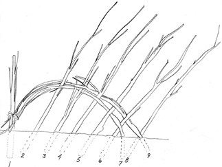 - Place wand #9 to cross #8, and weave it back to the anchor