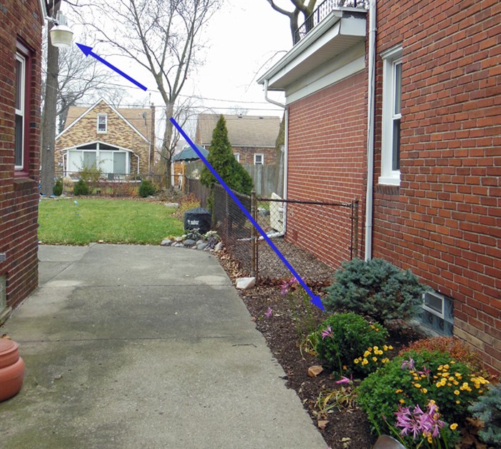 The mums opened their flowers in a patchy show at Thanksgiving. The disruptive light came from above and left (arrows) so only low brancheson the right side and in back had the necessary darkness to form yellow flowers. We'll move them far from that night light, next year.
