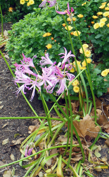 Those are plants that were already established in this garden when we came on the scene. The owner's no longer sure of the name but we're fairly certain it's Nerine bowdenii. It's a summer-dormant South African "bulb" normally only hardy to about 5F -- zone 7. It found itself a sheltered place in this zone 6 yard.