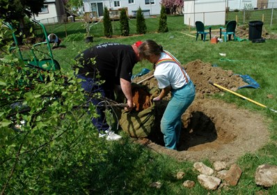 using the unwrapped burlap as a sling to lower it into its hole.