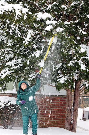 brush up. Insert a broom or a rake under the snowy branch. Then