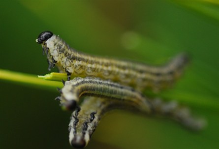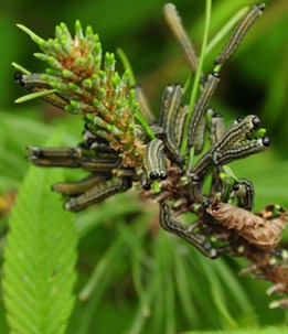 Below, right: The sawflies freeze in needle-like posture when