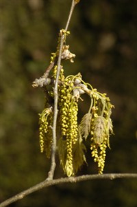 Right: Oak flowers dangle from a mature branch.