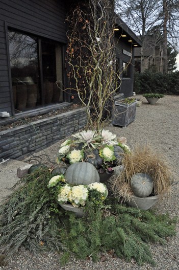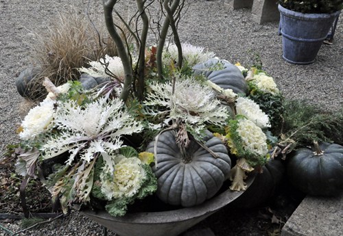 (Salix matsudana 'Tortuosa') with various ornamental kale