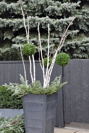 Below, left: White birch or poplar branches hung with boxwood
