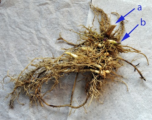 previous season's stem base (A) and this shoot (B). However, with