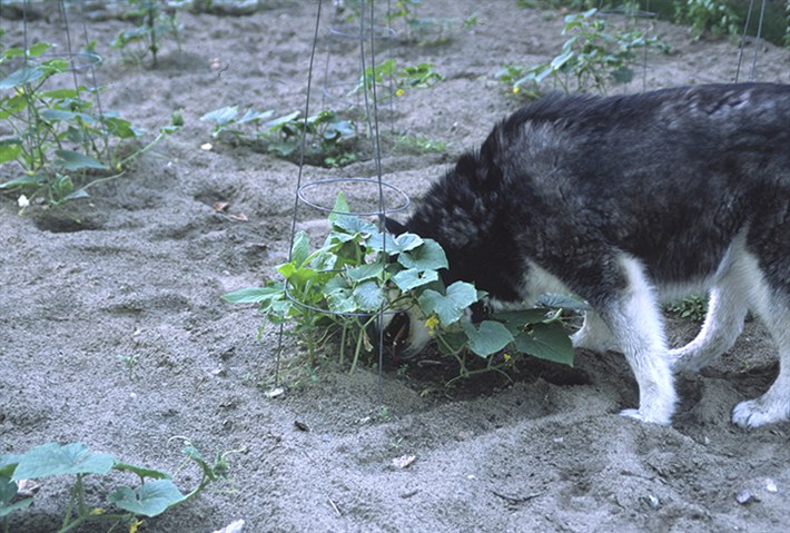 Crystal eating something out in the yard -- a cucumber plant! We