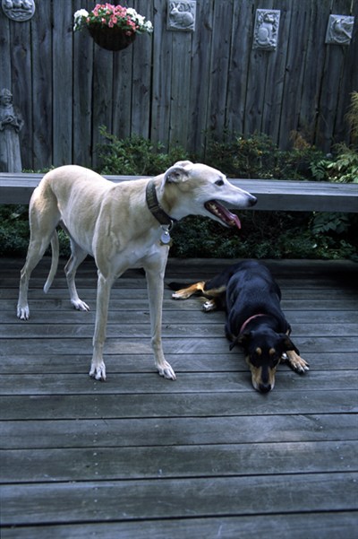 Greyhound Mariah and Doberman-mix Leila