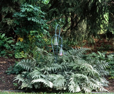 fern (Athyrium japonicum 'Pictum', below, right) is