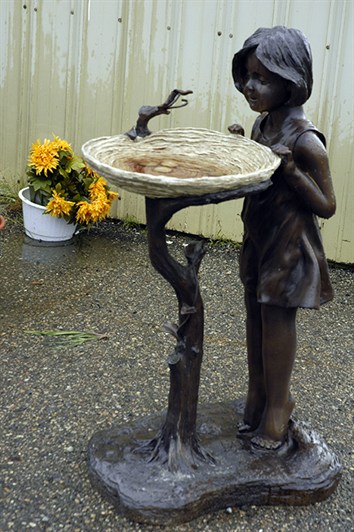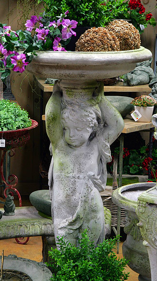shops, bird food sellers, home stores, art fairs, concrete statuary