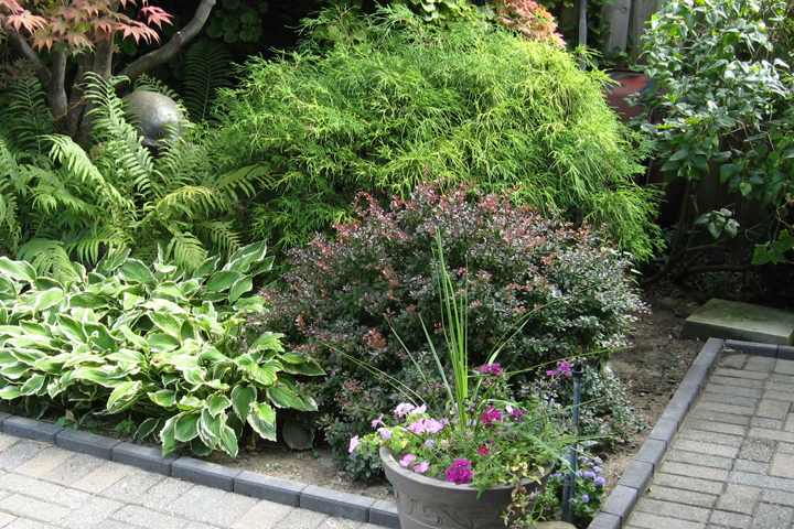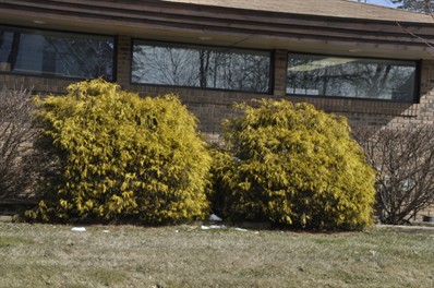 three gold mop falsecypresses in the foreground, three dwarf globe