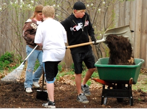 enlarge this imageBobbie Tripp, Baylee Rooksberry and Cody Tripp hustle to fill wheelbarrows delivered to the mulch pile by other volunteers at our Detroit Zoo Adopt-A-Garden. Our own version of a relay race.