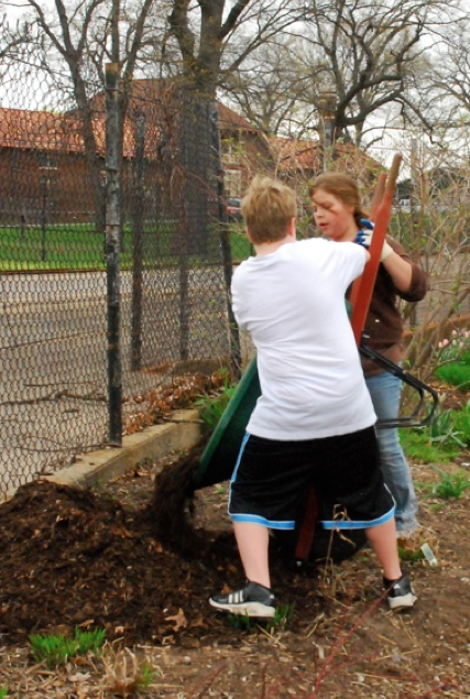 enlarge this imageBobbie Tripp, Baylee Rooksberry and Cody Tripp hustle to fill wheelbarrows delivered to the mulch pile by other volunteers at our Detroit Zoo Adopt-A-Garden. Our own version of a relay race.