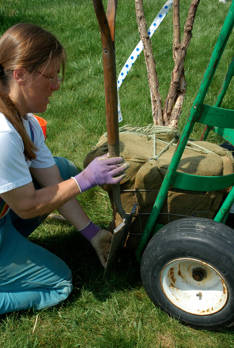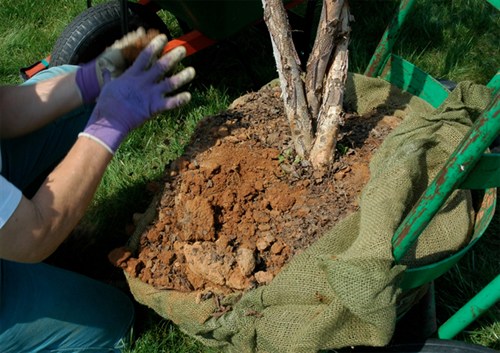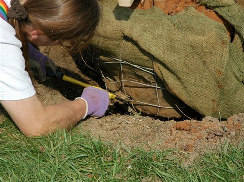 Wadded burlap atop a root ball or extra soil at a pot's surface