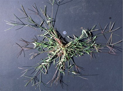Crabgrass is a flat-profile annual weed that sprouts once the soil
