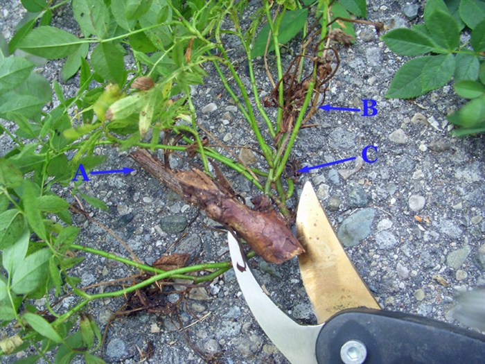 Below: A: Dead wood. B: Earlier growth has been dying back.