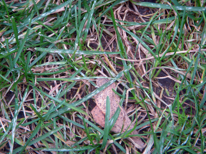 in a sunny place where feet trod regularly, bluegrass' wide blades